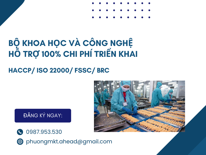 - Được hỗ trợ 100% chi phí thực hiện tư vấn xây dựng và áp dụng thành công HACCP/ ISO 2000/ BRC/ FSSC 22000 kết hợp với các công cụ cải tiến năng suất chất lượng 5S/ Kaizen/ 7 công cụ/ QCC.