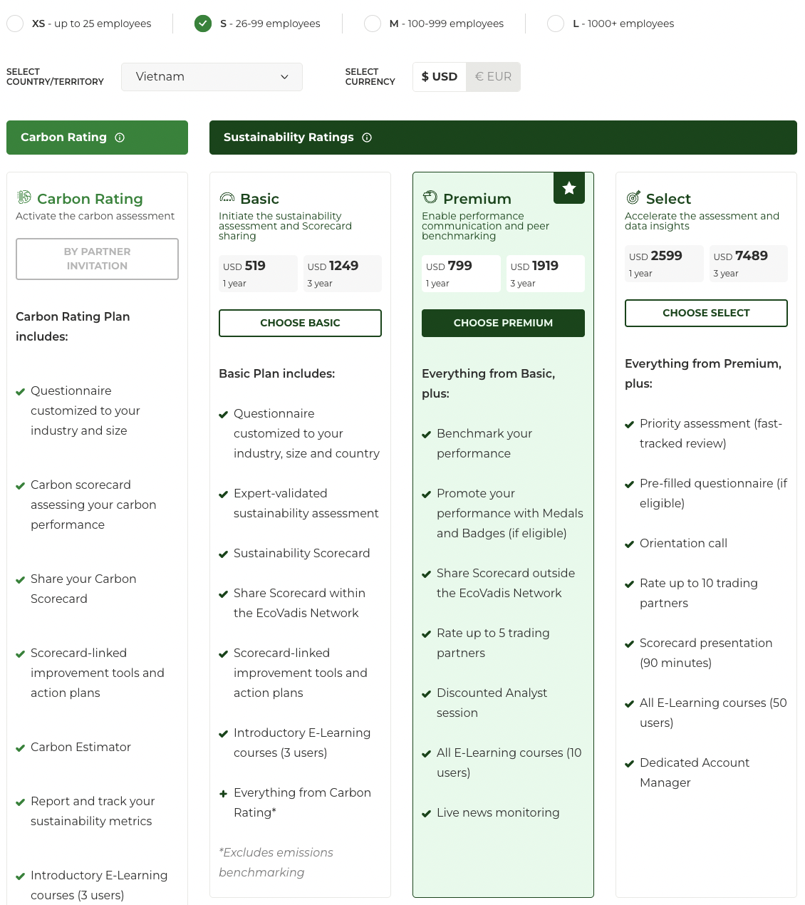 ► Các gói cao hơn có thêm chức năng (phân tích nâng cao, nhiều địa điểm, nhiều khách hàng kết nối, chia sẻ kết quả ngoài nền tảng Ecovadis…)