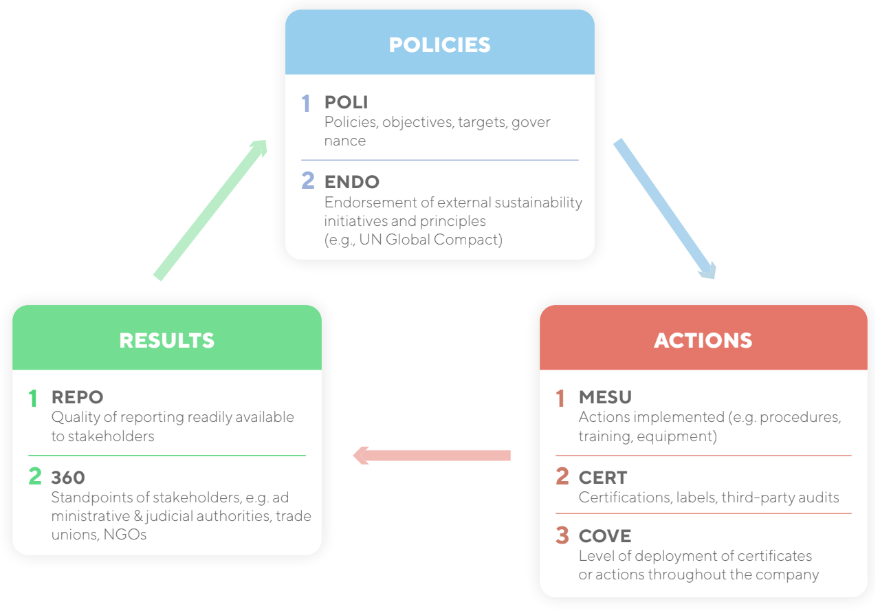 Bên dưới điểm tổng thể, điểm số được chia theo 4 chủ đề, mỗi chủ đề được đánh giá dựa trên khung Policies, Actions, Results (Chính sách, Hành động và Kết quả), nhằm đo lường chất lượng hệ thống quản lý bền vững của một công ty thông qua 3 trụ cột quản lý